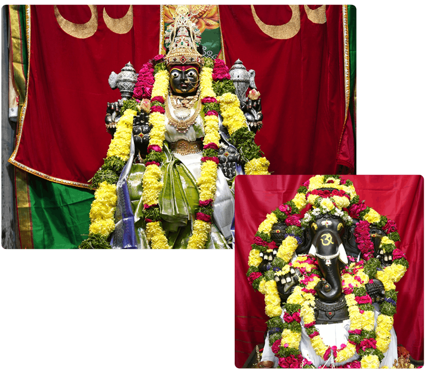 Lord Vinayaka, the remover of obstacles and the god of beginnings, resides on the right side of the sanctum. Worshipping him ensures success in endeavors, clarity in thought, and protection from negativity. His gentle yet powerful presence guides devotees on the path of righteousness and spiritual awakening.